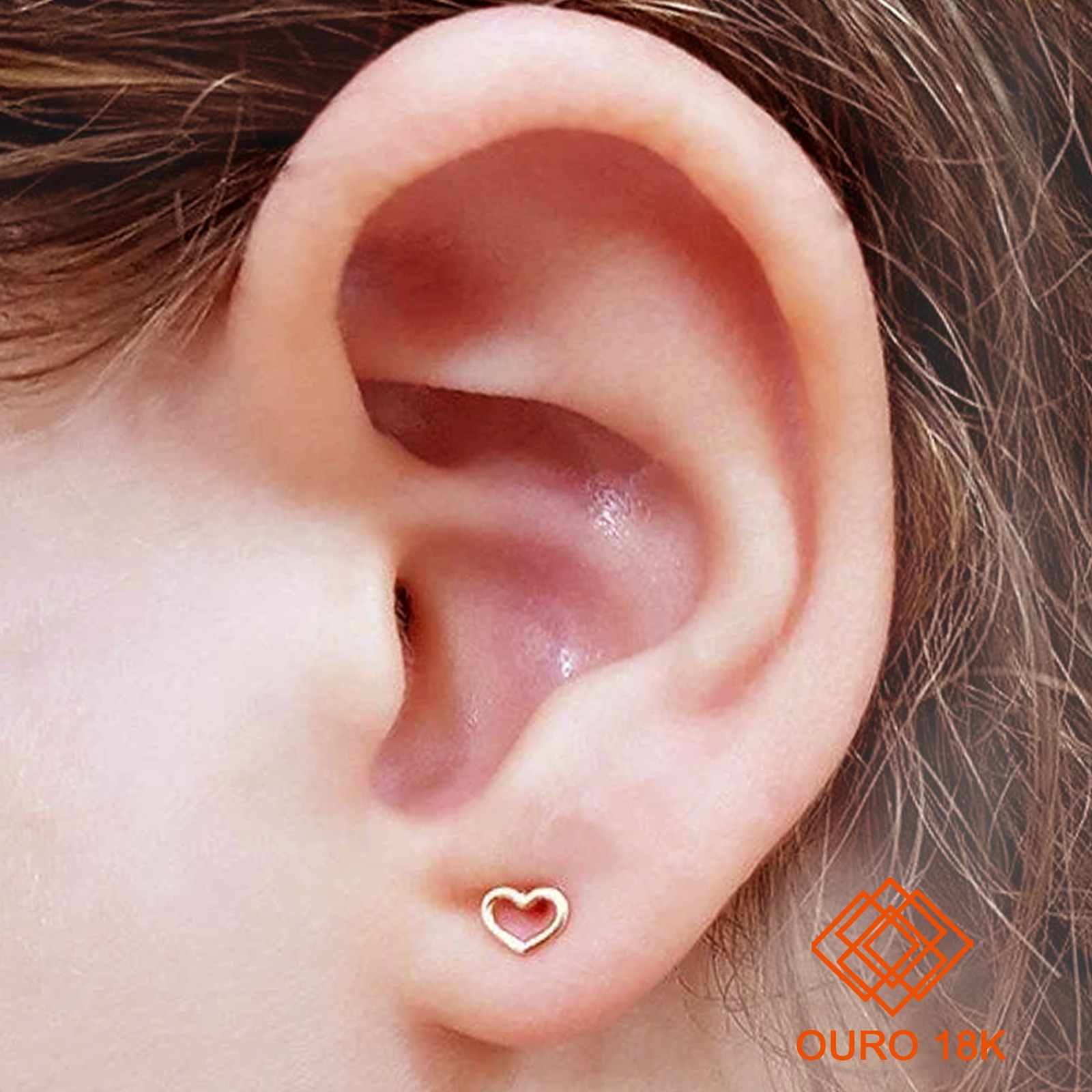 Brinco coração vazado confeccionado em ouro 18k. Uma joia bela e romântica, com um design clássico e elegante essa peça traz harmonia em diversas combinações com peças luxuosas com também em composições mais delicadas. Seu tamanho pequeno permite também a utilização no segundo furo, se tornando um peça versátil e valorizando suas composições.