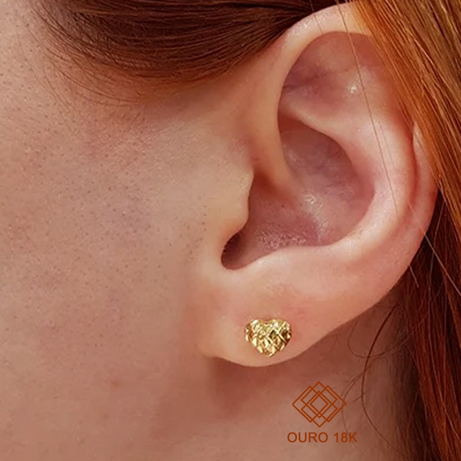 O brinco coração é confeccionado em ouro 18k. Uma joia delicada e romântica. Sua beleza se destaca pelo elegante trabalho com texturase recortes que dão ainda mais charme a peça valorizando suas composições do dia a dia.