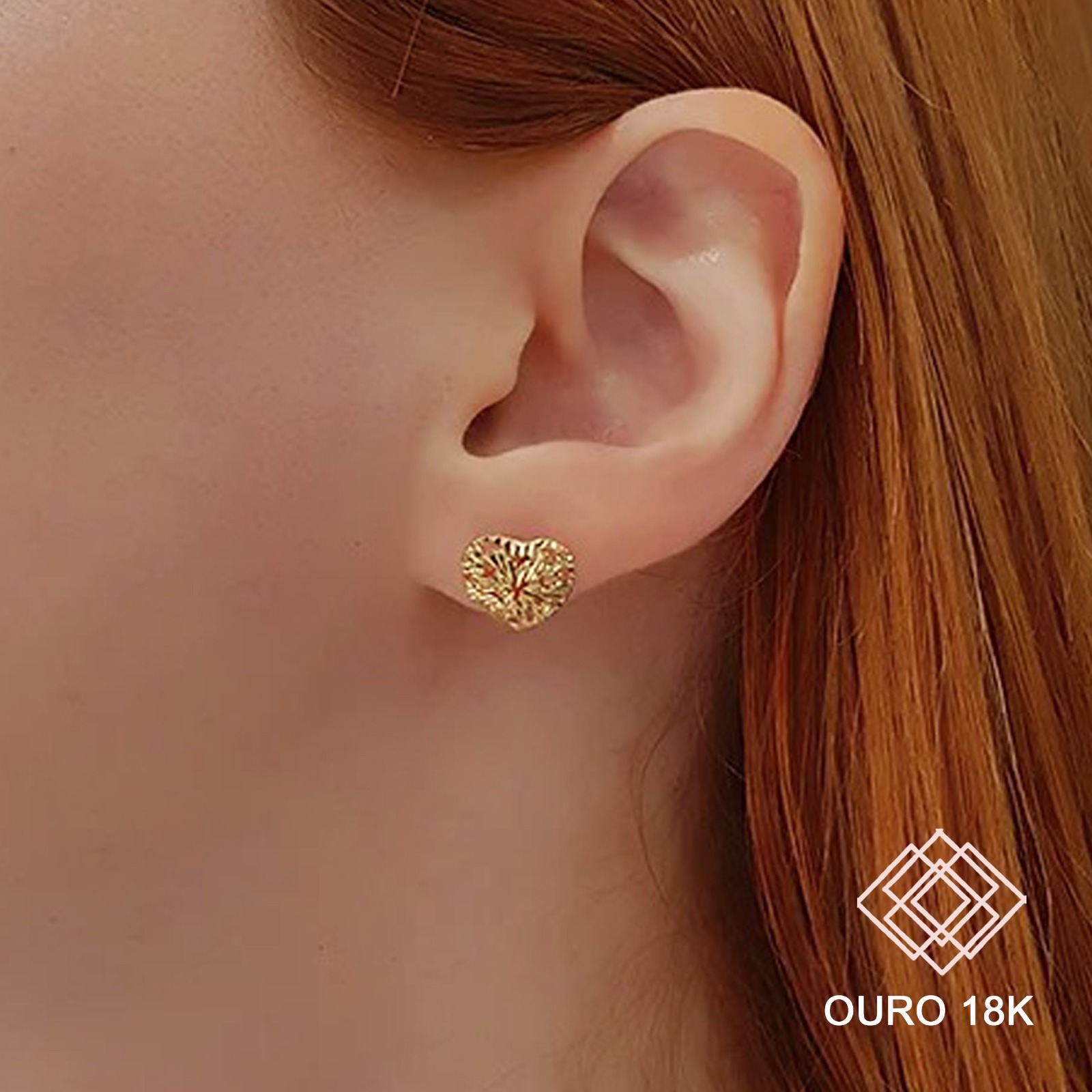O brinco coração é confeccionado em ouro 18k. Uma joia delicada e romântica. Sua beleza se destaca pelo elegante trabalho com texturas lisas que dão ainda mais charme a peça valorizando suas composições do dia a dia.