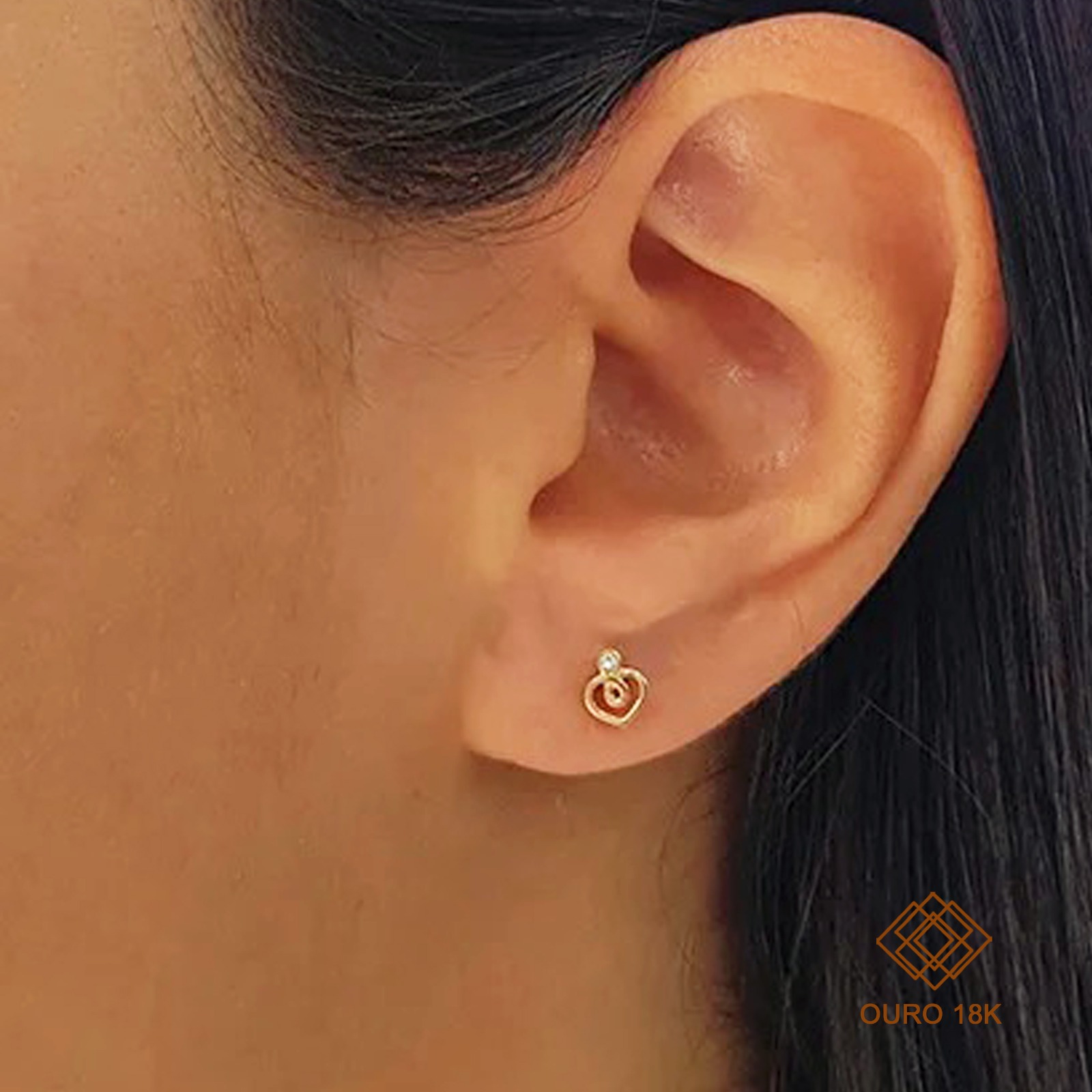 A qualidade do ouro 18k estruturada em uma joia delicada e elegante. Brinco design coração, cravejado com topázio, em tamanho menor perfeito para composições de segundo furo.