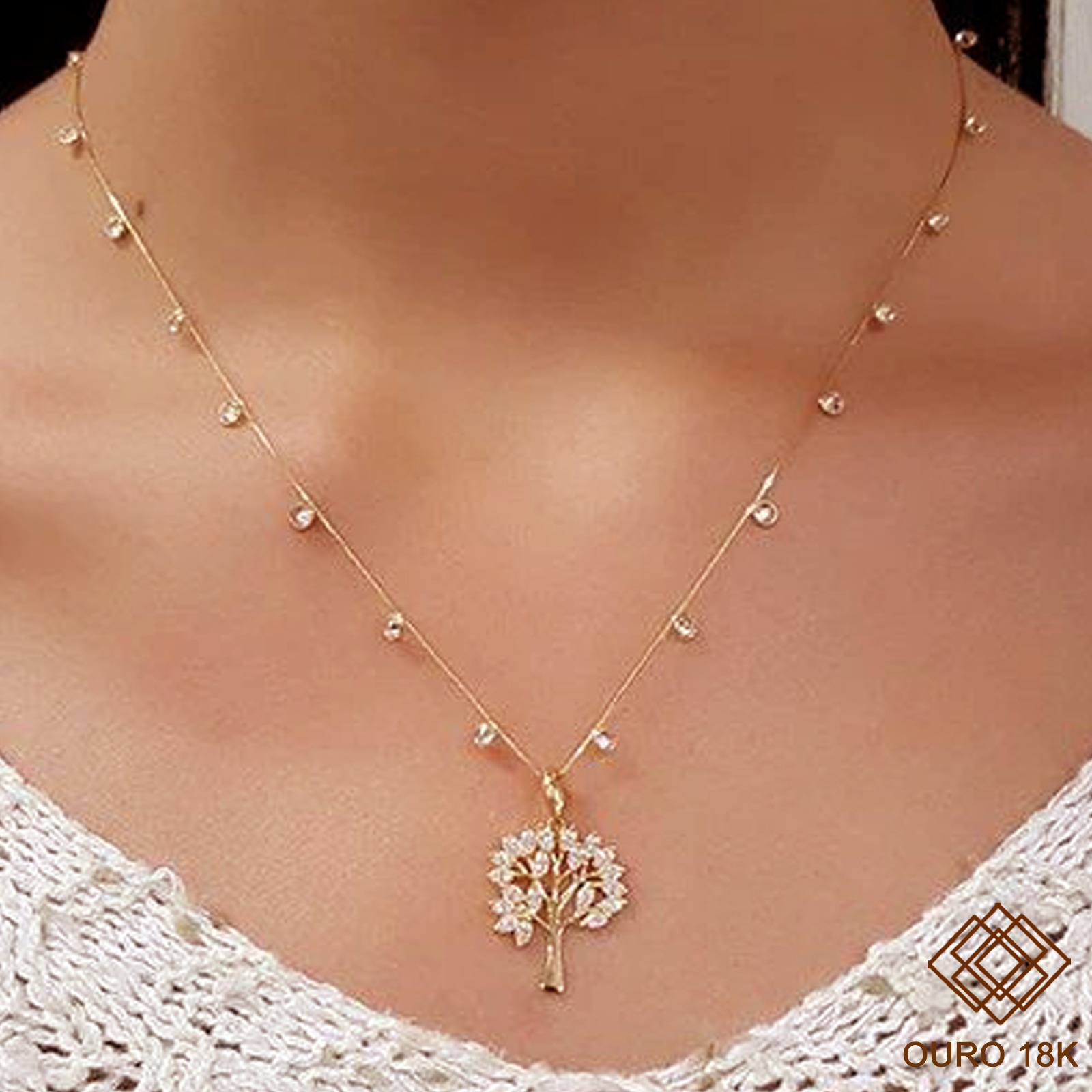 A gargantilha é confeccionada em ouro 18k e cravejada com pedras zircônias. Uma joia única com elegante corrente com cravação de de zircônias. Destaque para a delicada árvore da vida com cravação em suas folhas.Uma peça que valoriza todas composições perfeita para o dia a dia!