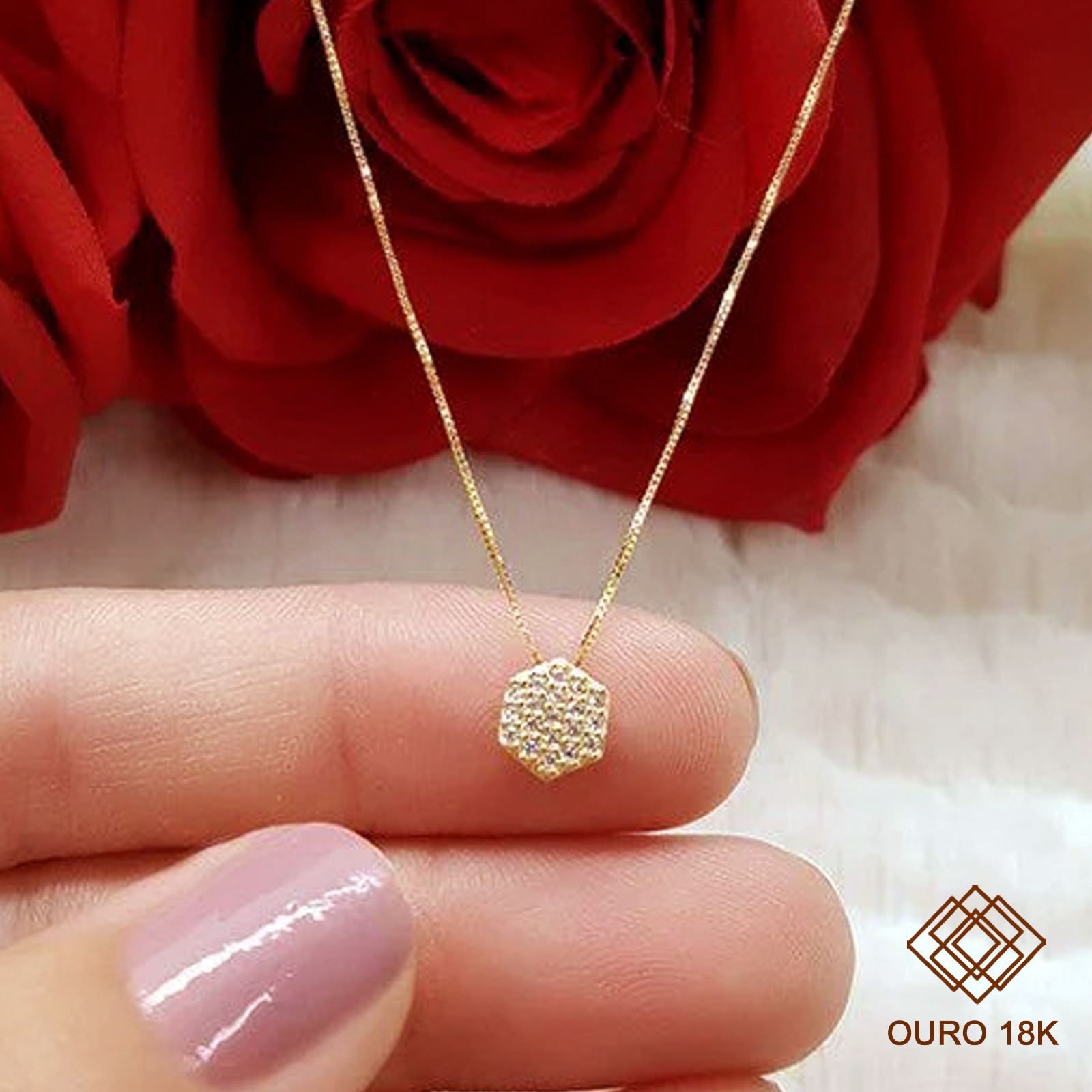 A gargantilha é confeccionada em ouro 18k e cravejada com zircônias. Com elegante design chuveiro em formato sextavado é aquela peça clássica que deve estar presente em sua caixa de joias.