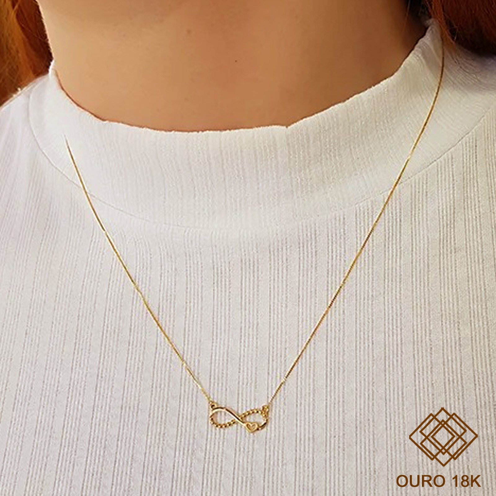 A gargantilha é confeccionada em ouro 18k e cravejada com zircônias. Um destaque dessa joia é seu trabalho em delicadas esferas e coração vazado que compõe o símbolo do infinito, perfeito para quem ama joias menores e delicadas.