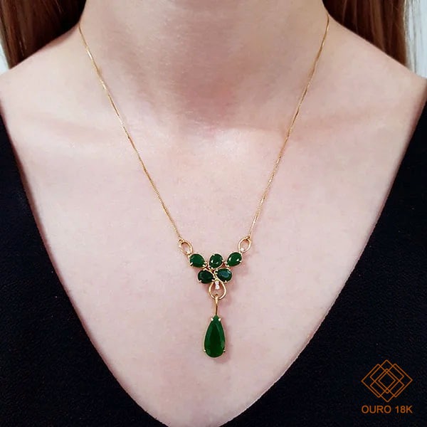 Uma gargantilha perfeita para os momentos especiais, opção para trazer beleza e elegância à sua produção. Destaque para as pedras em estilo gota, sendo jade verde e o delicado acabamento com diamantes.