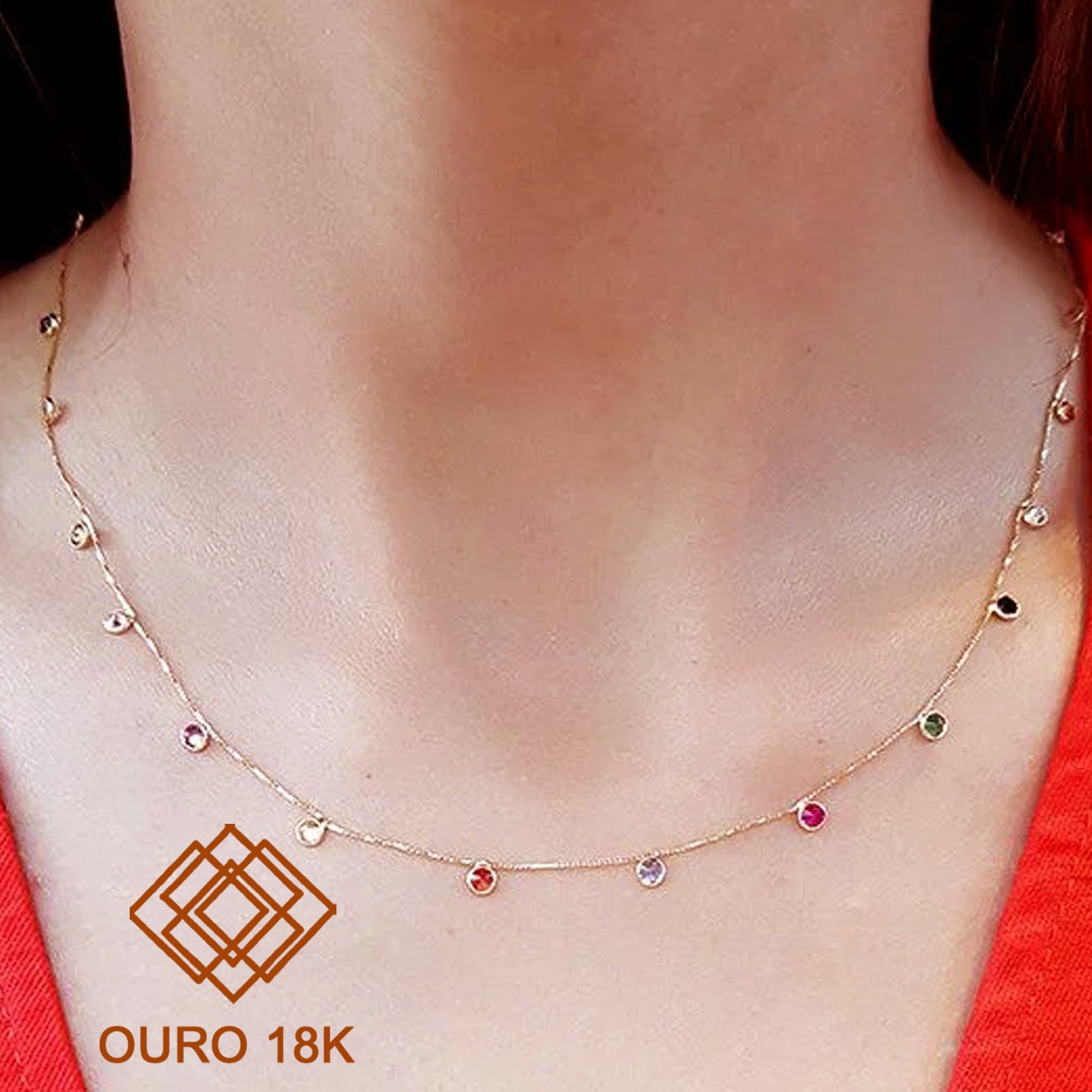 A gargantilha perfeita para suas composições! Confeccionada em ouro 18k. Seu design com pingentes redondos cravejados com zircônias coloridas a torna uma joia elegante e jovial que valoriza suas composições trazendo ainda mais brilho para elas!