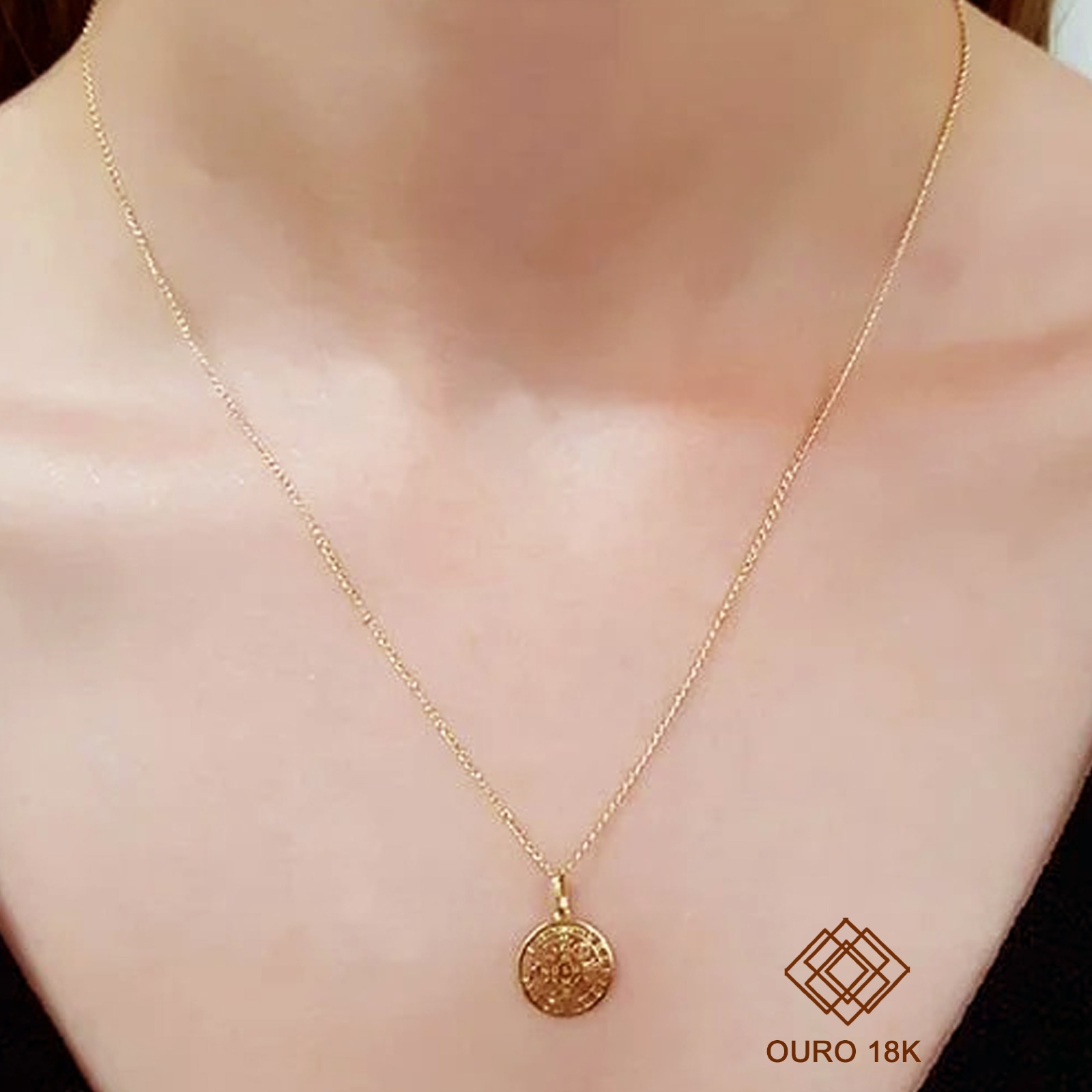 O cordão e este lindo pingente São Bento, confeccionados em ouro 18k, trazem delicadeza e qualidade para as composições do seu dia a dia. Destaque para o pingente com design vazado, de tamanho médio.