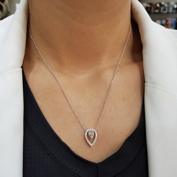 A gargantilha em prata 925 é uma joia clássica e sofisticada, perfeita para quem aprecia brilho e elegância atemporal. Seu pingente possui design gota que destaca a pedra central, envolvida por um delicado contorno cravejado que intensifica a luminosidade da peça.