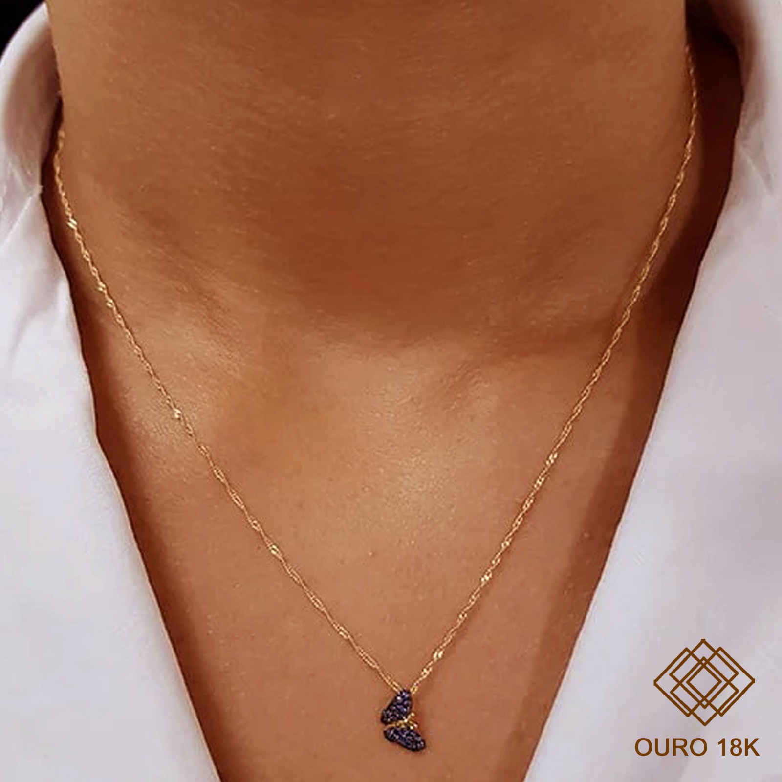 O cordão em malha singapura com delicado pingente de borboleta. Destaque para a cravação com zircônias na cor azul, que trazem beleza e atenção. Uma gargantilha toda em ouro 18k, a qualidade certa para te acompanhar em todos os momentos.