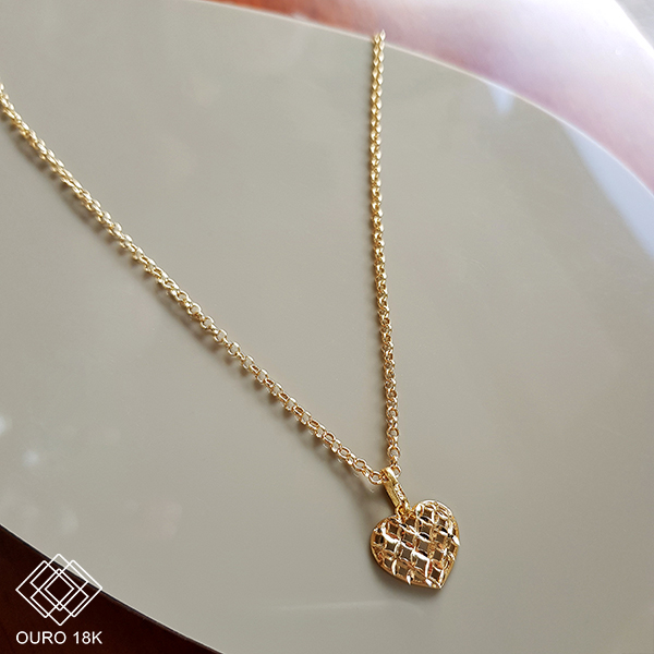 Gargantilha em ouro 18k composta por elo português e pingente coração. Seu design diamantado traz ainda mais brilho para essa joia. Uma peça que por seu tamanho menor valoriza suas composições de forma versátil com sofisticação e romance.