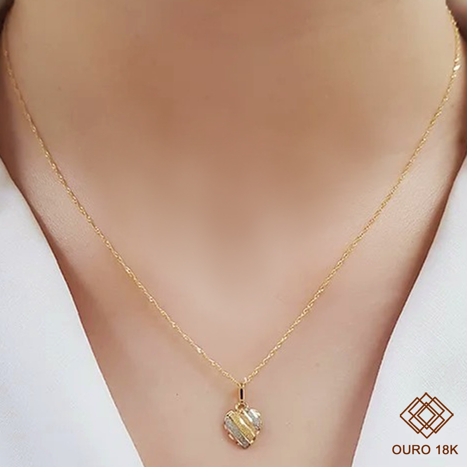 Gargantilha em ouro 18k composta por fio singapura e pingente coração em design três tons e suaves marcações e texturas.