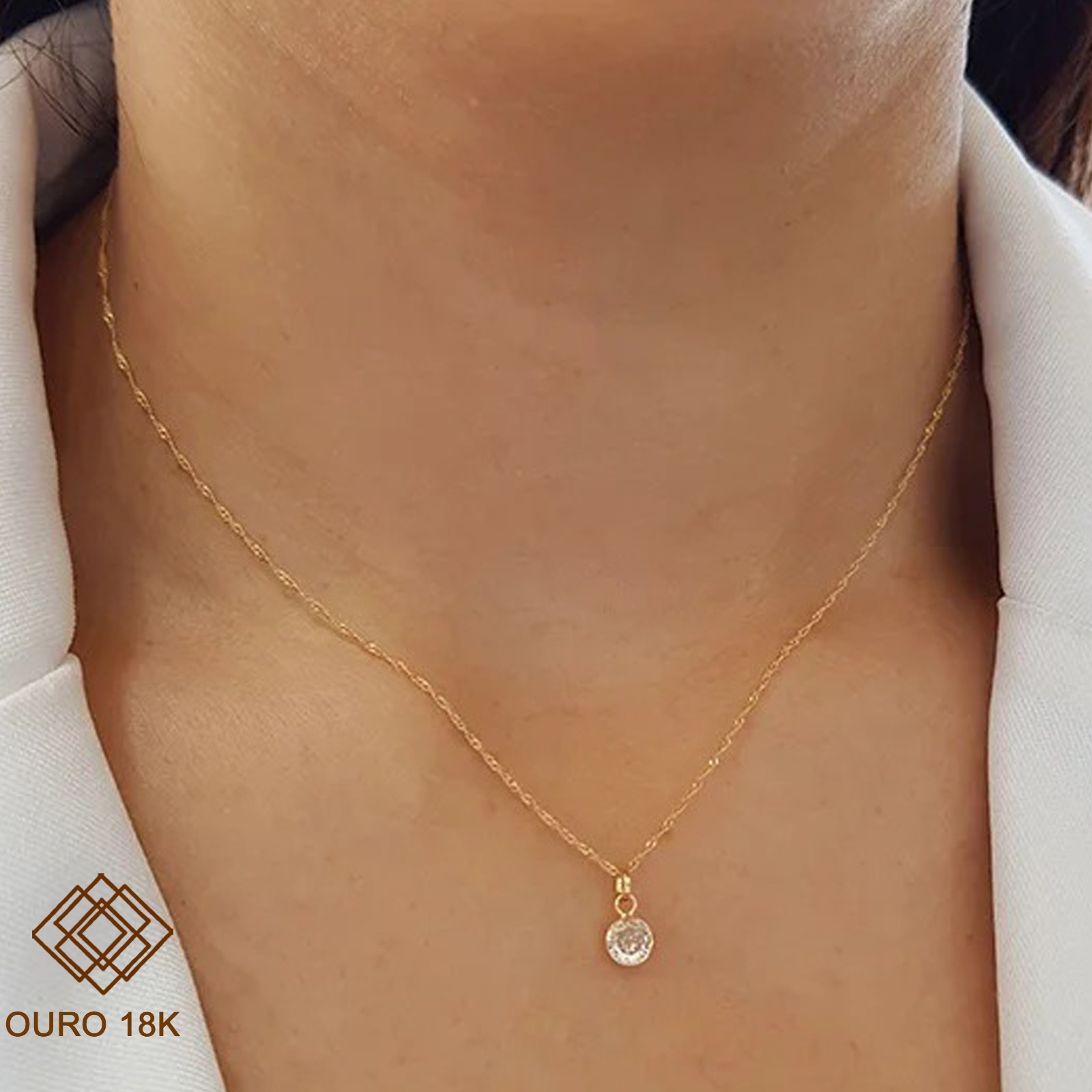 Gargantilha em ouro 18k composta por malha singapura e pingente ponto de luz, cravejado com zircônia. Uma joai clássica e elegante.