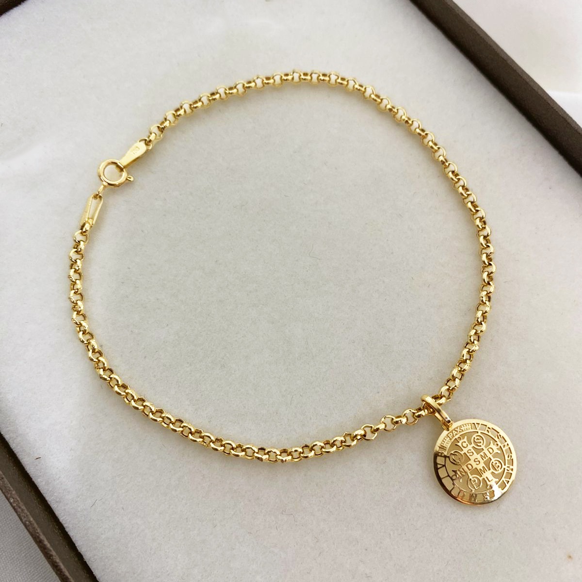 A pulseira em malha elo português e este lindo pingente São Bento, confeccionados em ouro 18k, trazem delicadeza e qualidade para as composições do seu dia a dia. Aproveite e garanta já a sua!