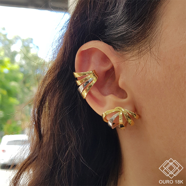 Confeccionado todo em ouro 18k, com elegante acabamento em ródio branco e estrutura vazada. Este design possui o diferencial de ser de pressão, sendo assim se encaixa nas produções sem necessitar de furo na orelha.