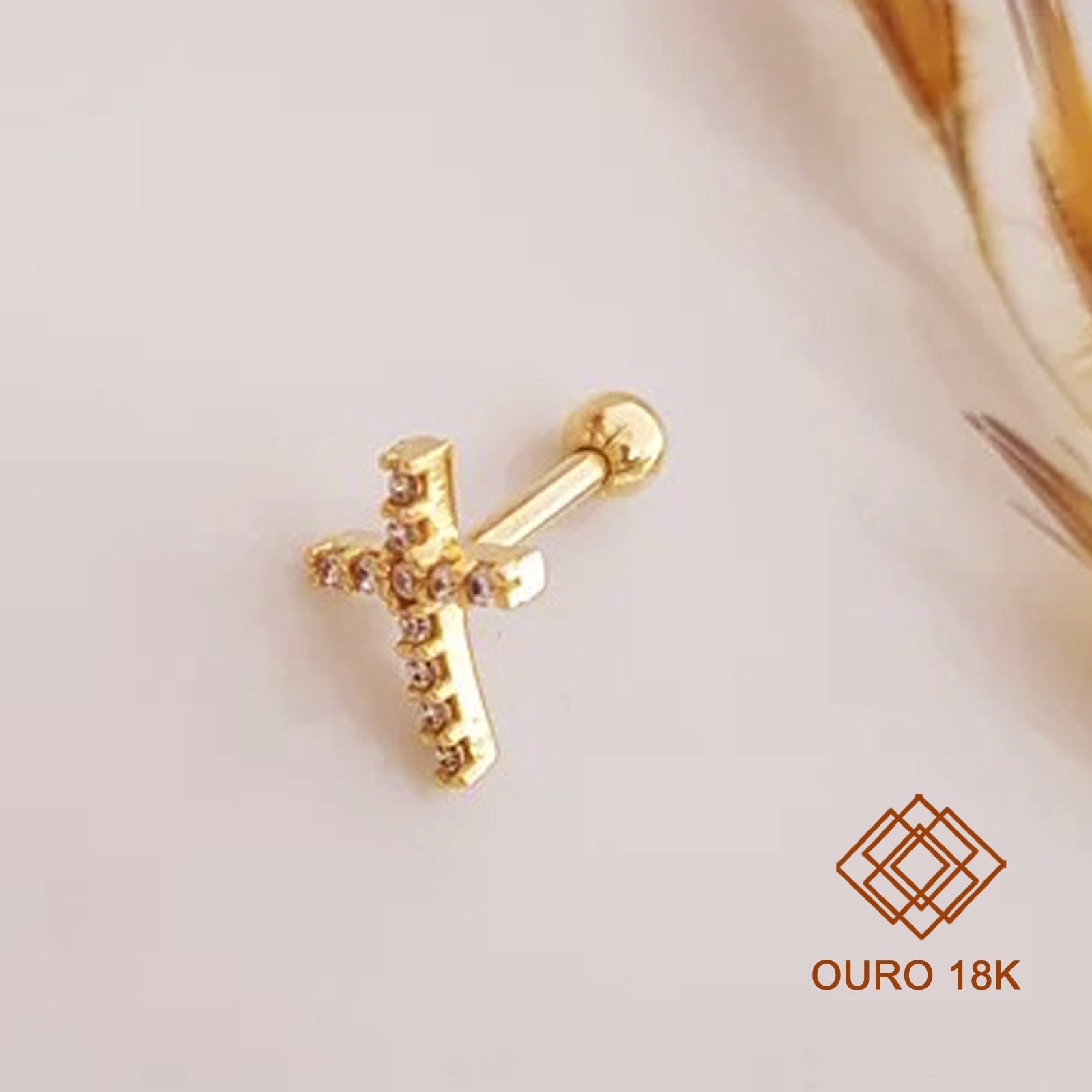 O piercing é confeccionado em ouro 18k cravejado com zircônias. Uma joia moderna para você arrasar nas composições. Modelo com design de cruz, para dar mais delicadeza à peça, representando a sua fé