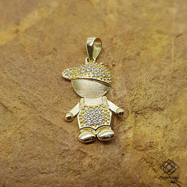 Confeccionado todo em ouro 18k e pingente cravejado com zircônias,cravação em seu boné e no centro de seu macacão traz ainda mais beleza e brilho para essa joia.