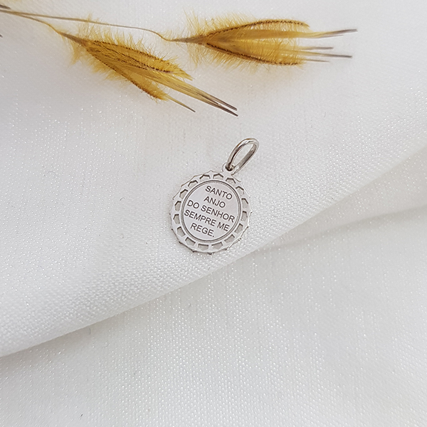 Uma joia cheia de significado, simbolizando proteção, força e fé. Seu design traz a frase "Santo anjo do Senhor sempre me rege" com riqueza de detalhes, transmitindo espiritualidade e devoção.