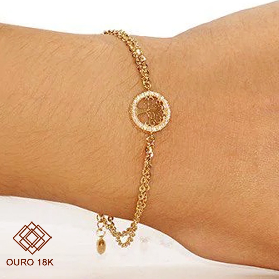 A pulseira em ouro 18k confere elegância e qualidade à suas produções. Um design elegante, com pingente central de árvore cravejado com zircônias e pulseira malha bailarina. Uma joia repleta de sofisticados acabamentos que traz ainda mais destaque para suas composições pelo brilho que a joia traz.
