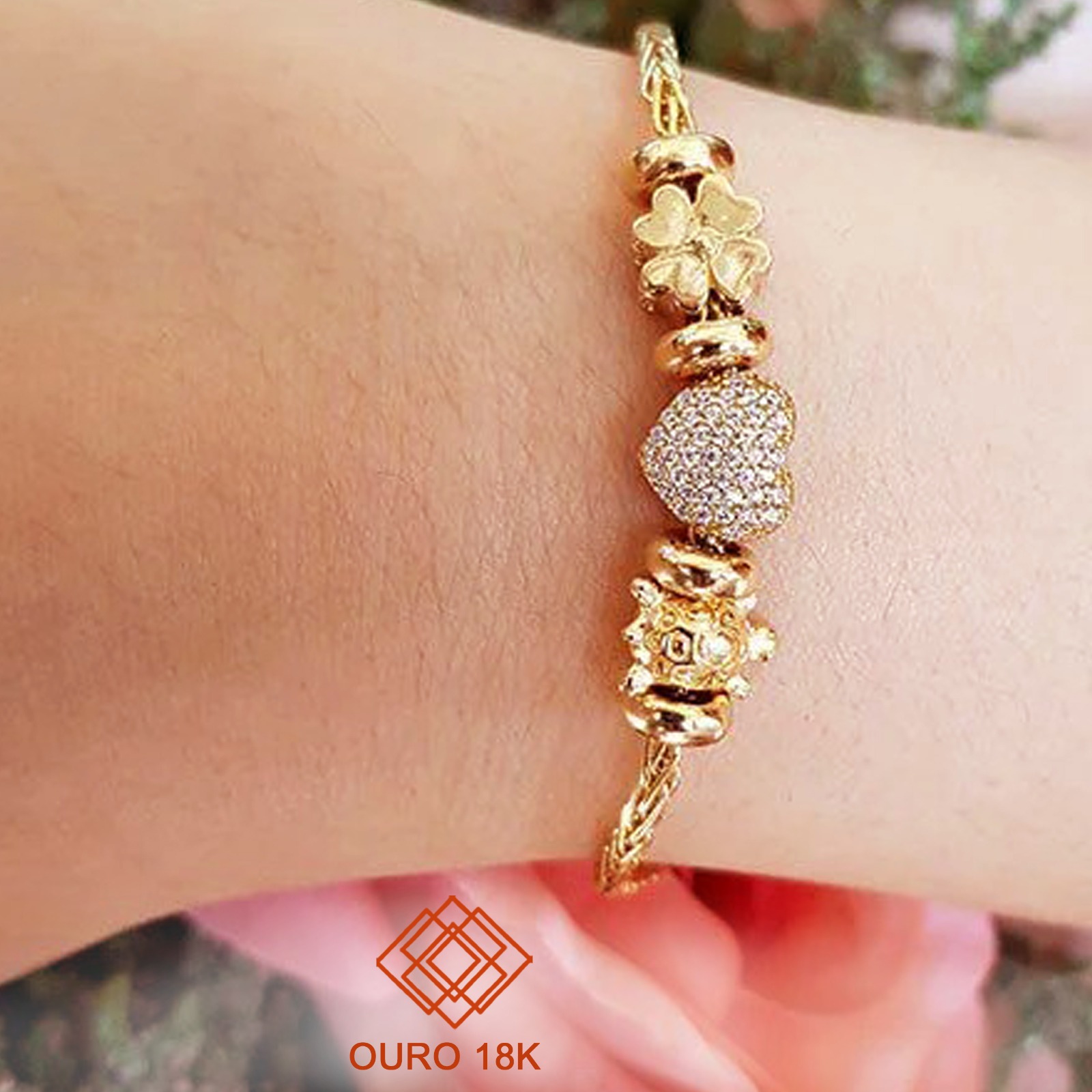 Esse modelo malha palmeira com berloques lisos, cravejados e simbólicos veio para encantar! Chamando a atenção pelo seu berloque de coração, que representa o amor, e seu pingente de trevo, trazendo boas energias e boa sorte.