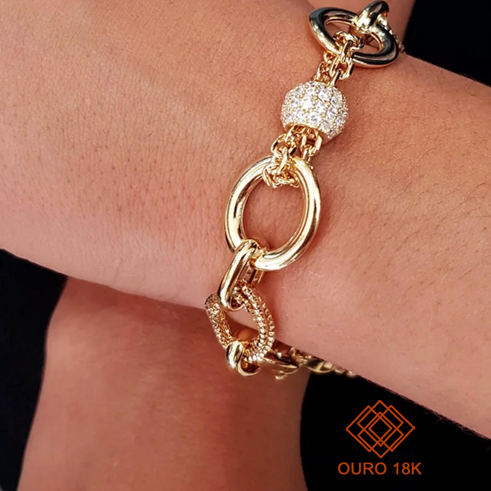 A pulseira em ouro 18k cravejada com zircônia confere elegância e qualidade às suas produções. Um design com mix de elos, repleto de elegantes acabamentos e texturas.
