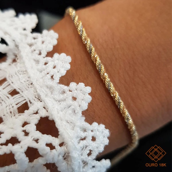 Design malha cabo de aço com trabalho em três tons de ouro 18k, uma joia versátil e elegante que você merece ter em sua coleção. Garanta esta pulseira!