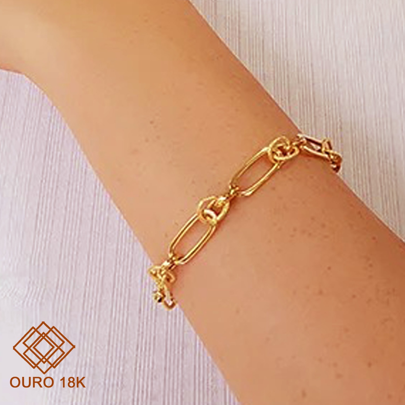 A pulseira em ouro 18k confere elegância e qualidade às suas produções. Um design super moderno,em malha cadeado, repleto de elegantes acabamentos e texturas.