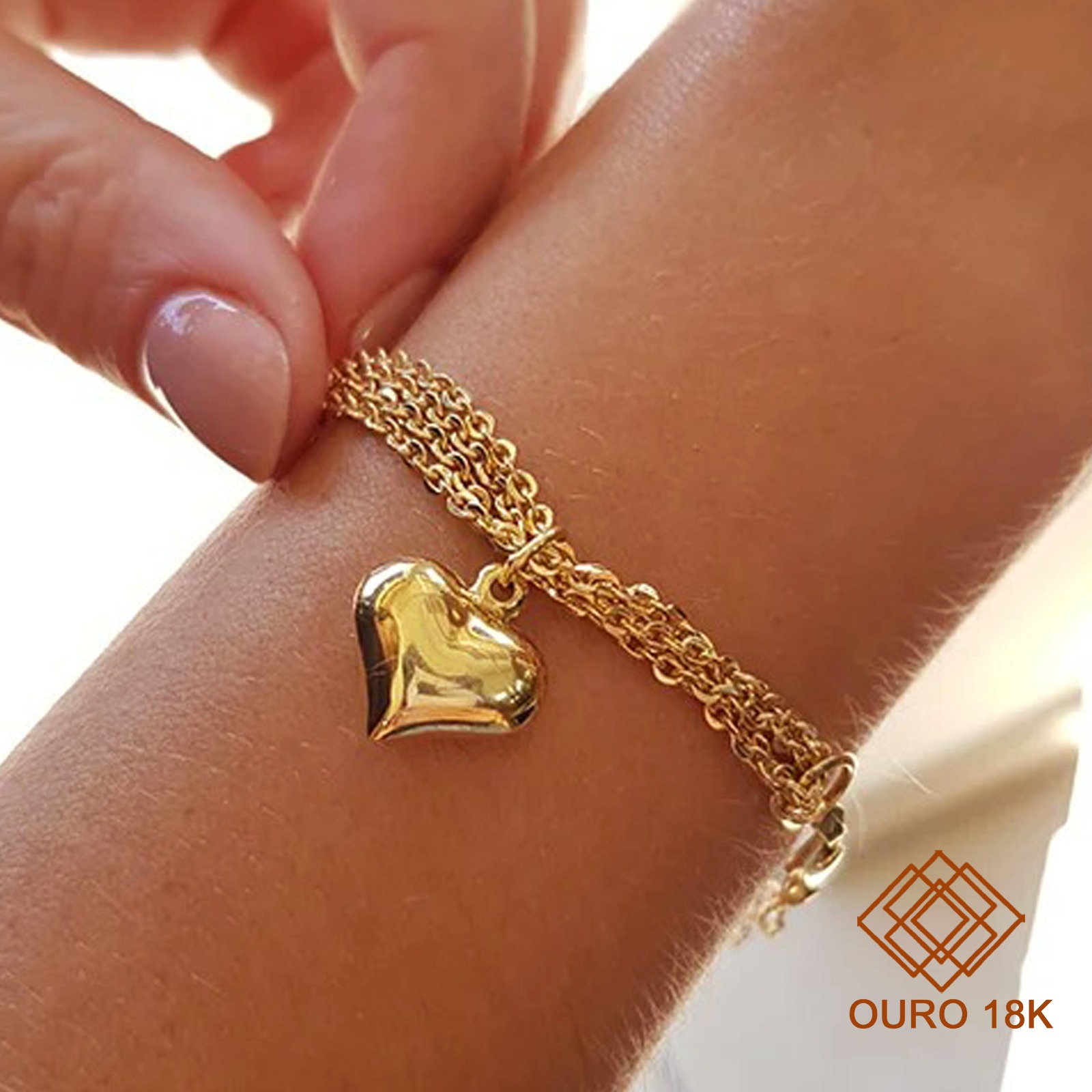 A pulseira em ouro 18k confere elegância e qualidade às suas produções. Um design moderno, repleto de elegantes acabamentos e texturas. Acompanhada por um pingente coração para tornar a composição ainda mais romântica.