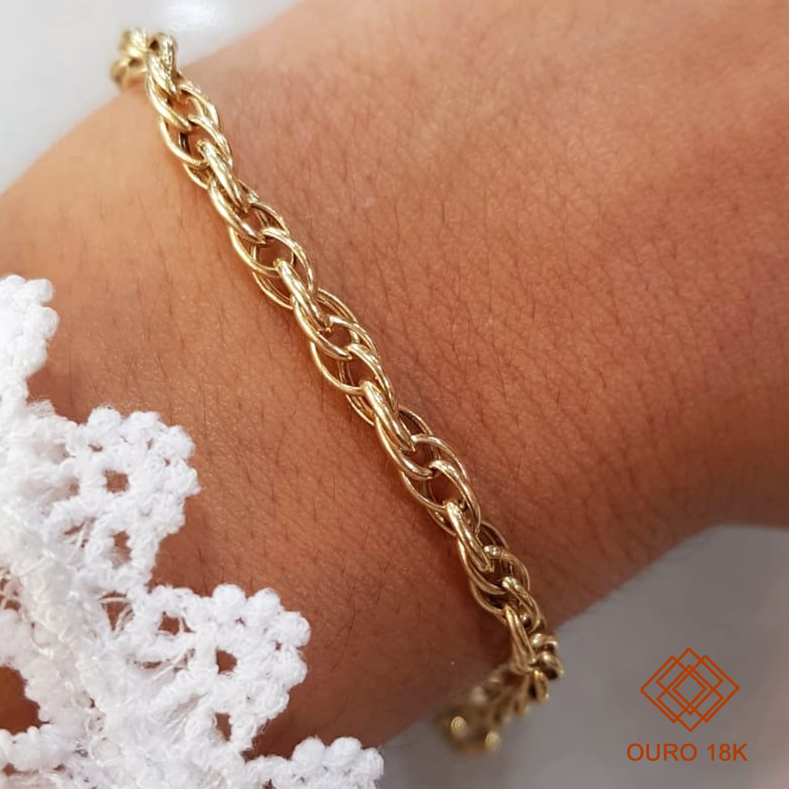 A pulseira em ouro 18k confere elegância e qualidade às suas produções.Pulseira maravilhosa, design de elos entrelaçados!