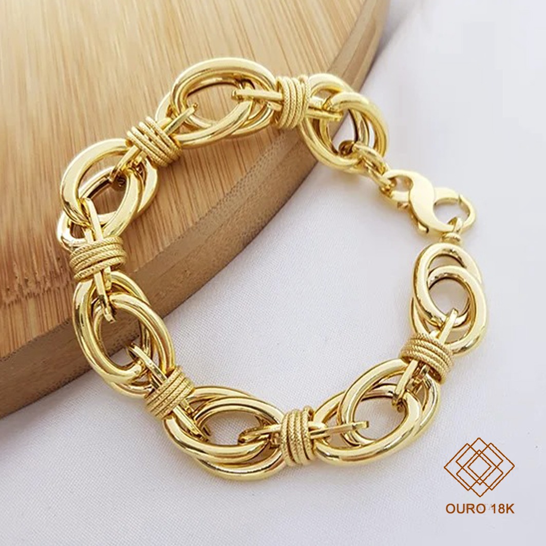 A pulseira em ouro 18k confere elegância e qualidade às suas produções. Um design clássico e atemporal, repleto de elegantes acabamentos e texturas. Com estrutura luxuosa é a pulseira perfeita para você que ama joias volumosas e vistosas!