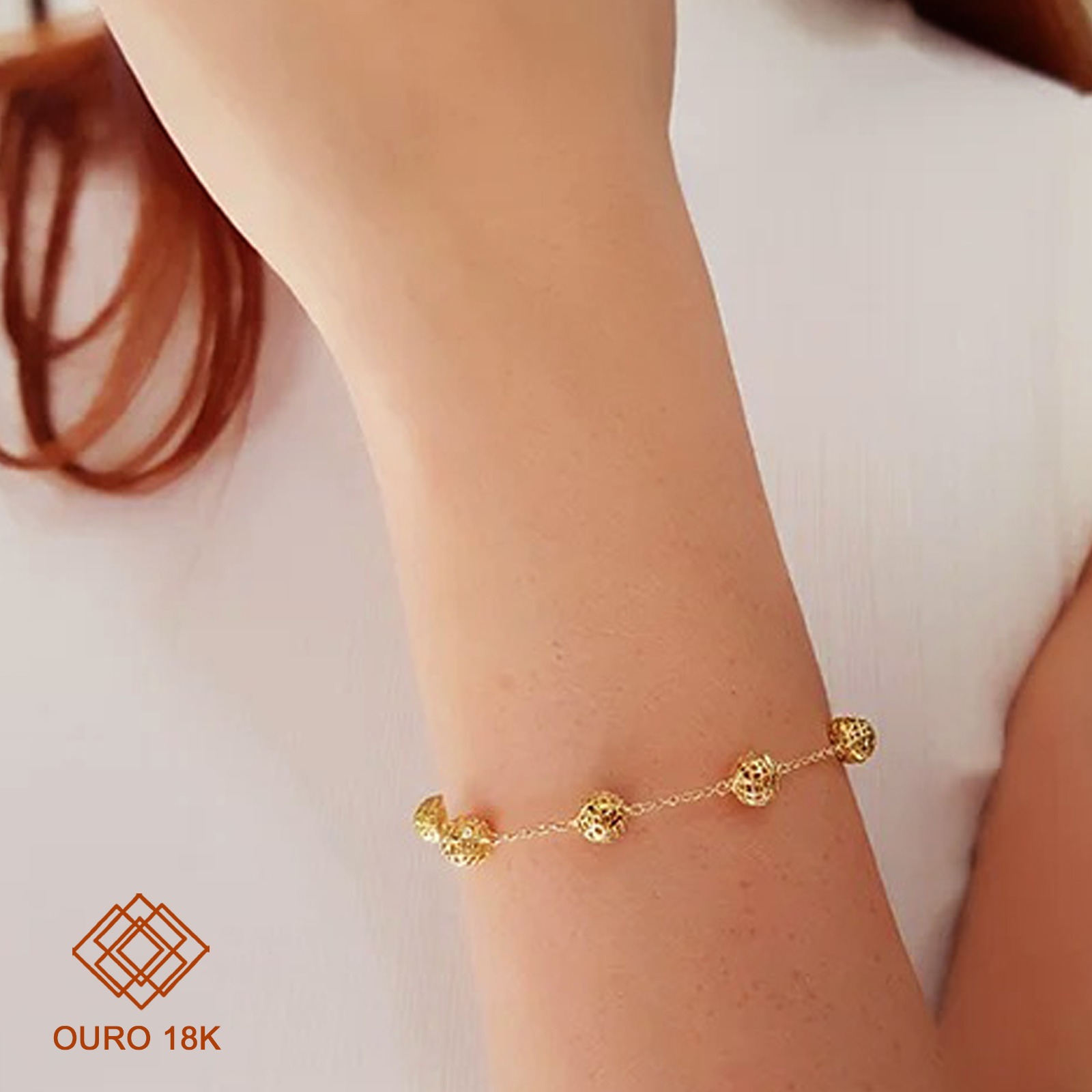A pulseira em ouro 18k confere elegância e qualidade à suas produções. possui clássicas esferas em estrutura filigrana seu design vazado traz ainda mais presença para essa joia devido ao charmoso contraste do ouro com a pele. Uma joia sofisticada e luxuosa, perfeita para valorizar suas composições e te acompanhar em todos os momentos!