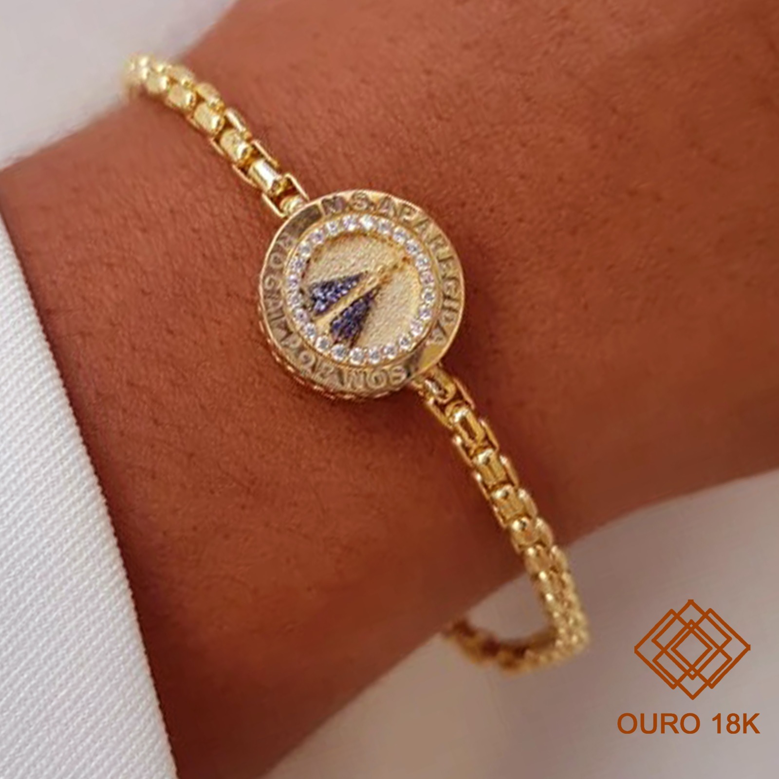 Símbolo de fé e proteção, esta pulseira é confeccionada em ouro 18K e destaca-se pela beleza da malha cadeado, conhecida por sua elegância e resistência. Ao centro, um medalhão detalhado traz a imagem de Nossa Senhora Aparecida, adornada com zircônias, que proporcionam brilho e sofisticação à peça.