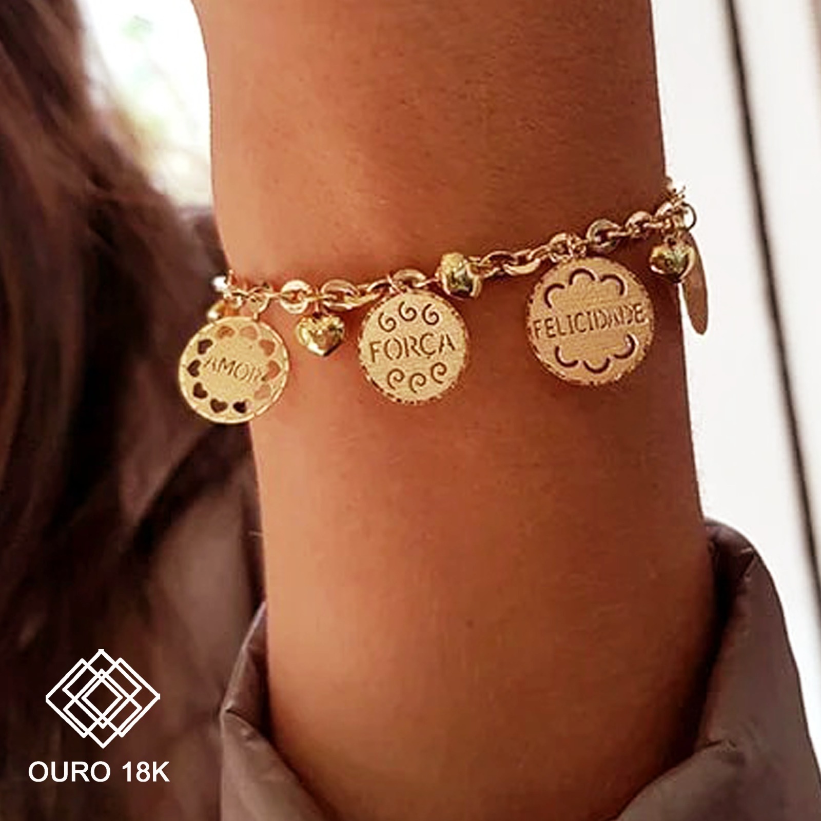 Destaque para os pingentes coração intercalados com o pingente placa onde cada um tem um desejo gravado, sendo um design vazado que traz ainda mais charme para essa joia e suas composições.