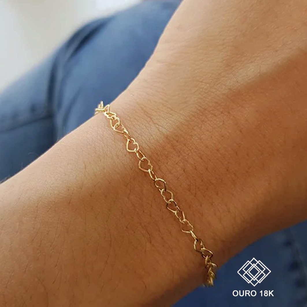 A pulseira em ouro 18k confere elegância e qualidade à suas produções. Um design delicado e romântico, com malha toda trabalha em delicados corações. Uma joia repleta de elegantes acabamentos que traz ainda mais destaque para suas composições!