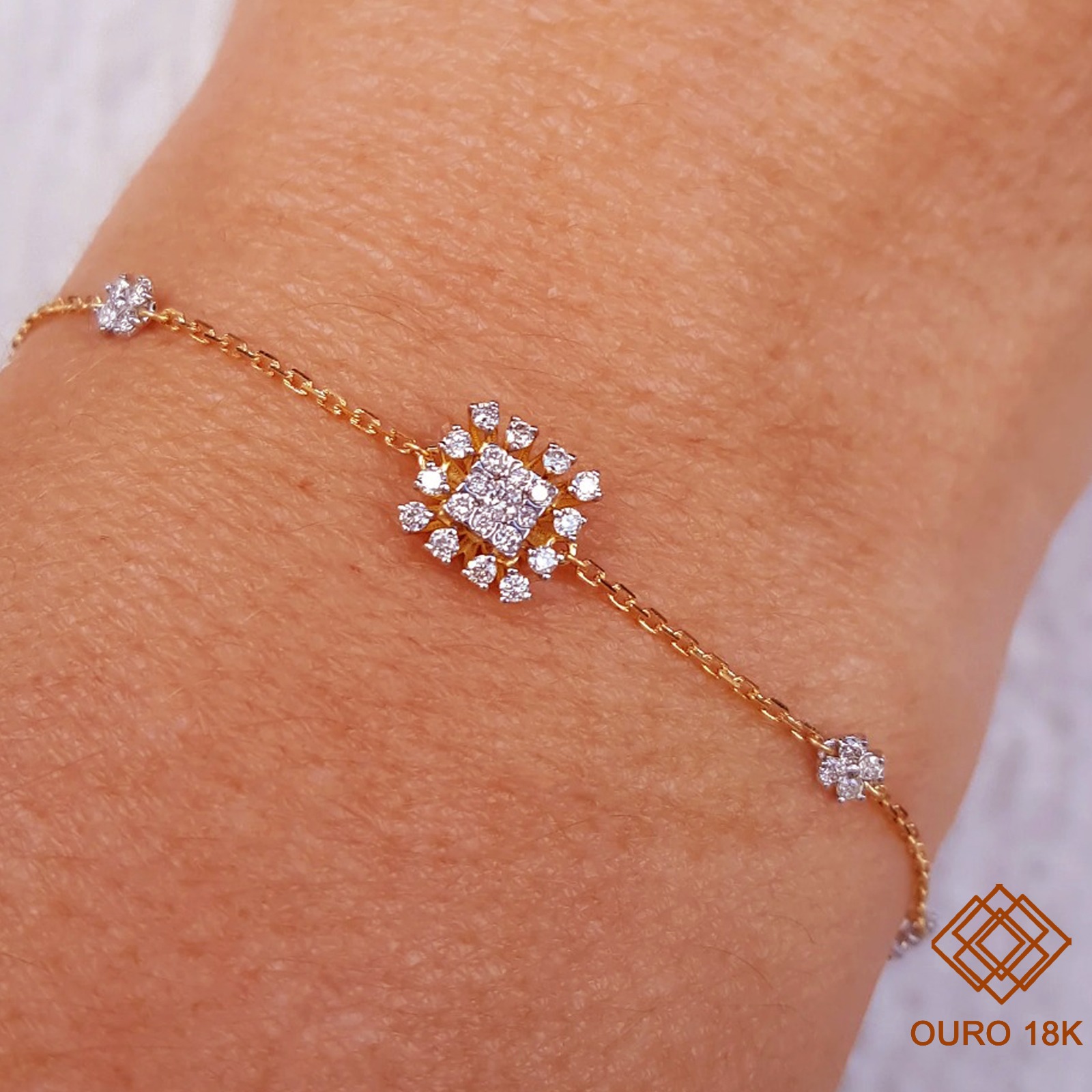 A pulseira em ouro 18k confere elegância e qualidade às suas produções. Um design clássico e atemporal, repleto de elegantes acabamentos e cravação de diamantes. Com estrutura luxuosa é a pulseira perfeita para você que ama joias elegantes e delicadas!