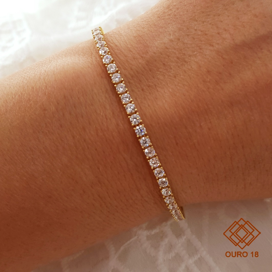 Elegante, confortável e indispensável! A pulseira é um acessório que desejamos sempre estar usando. Um design sofisticado confeccionado todo em ouro 18k. O charme desta pulseira vem dos detalhes! Um trabalho delicado nas cravações de zircônias que garante brilho para essa joia!