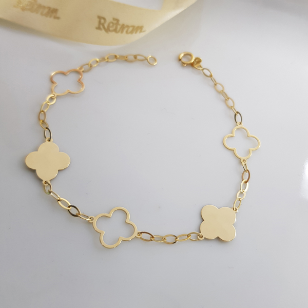 A pulseira em ouro 18k confere elegância e qualidade à suas produções. Um design delicado e elegante, com mix de pingentes vazados no formato de trevo, uma joia repleta de elegantes acabamentos.