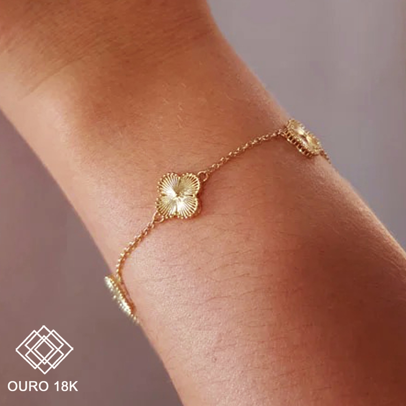 A pulseira em ouro 18k confere elegância e qualidade à suas produções. Um design delicado e elegante, com pingentes intercalados em formato de trevo. Uma joia repleta de elegantes acabamentos.