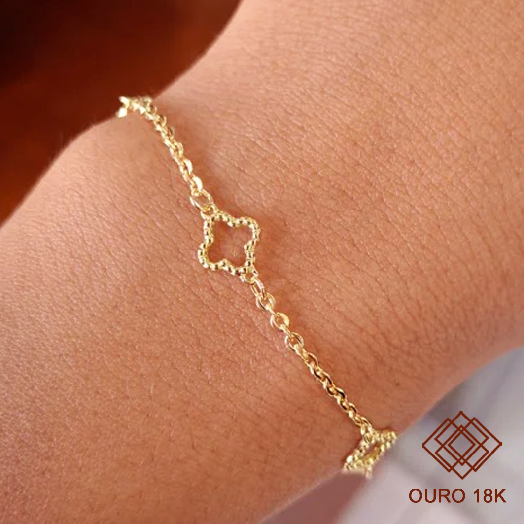 A pulseira em ouro 18k confere elegância e qualidade à suas produções. Um design delicado e elegante, pingente vazados em formato de trevo da sorte por toda sua extensão uma joia repleta de elegantes acabamentos.